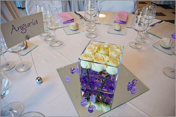 Vendela ivory roses for the centerpieces in glass cubes with some little lilac stones. These matched perfectly the atmosphere of Villa Ortea the reception venue Roberta and Omar chose for their party!