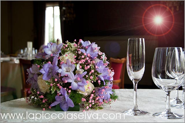 For this occasion we created big rounded centerpieces with lilac and scentful Freesias, Avalanche roses and pink Gypsophila.