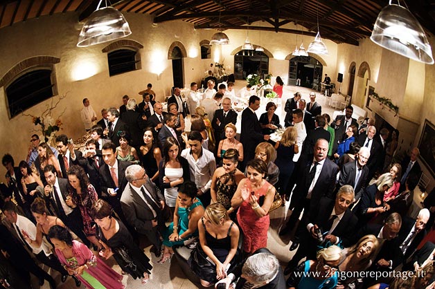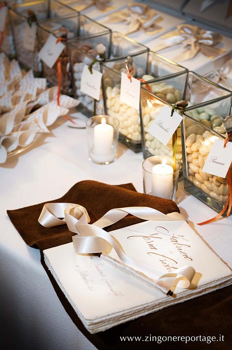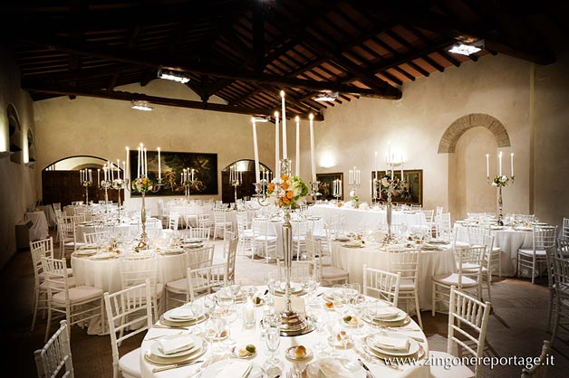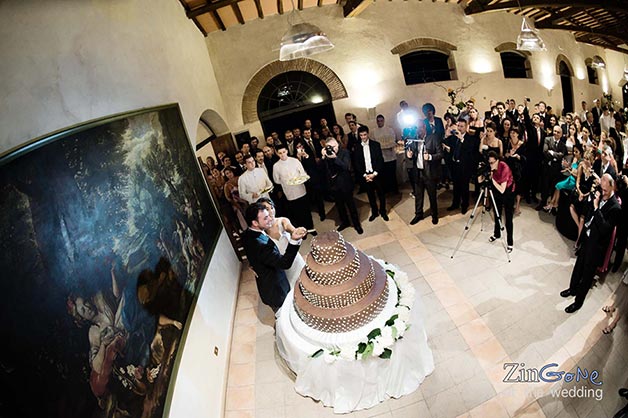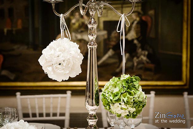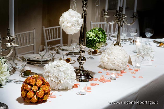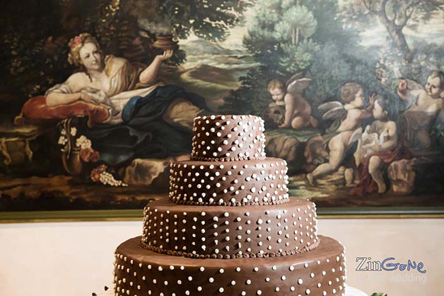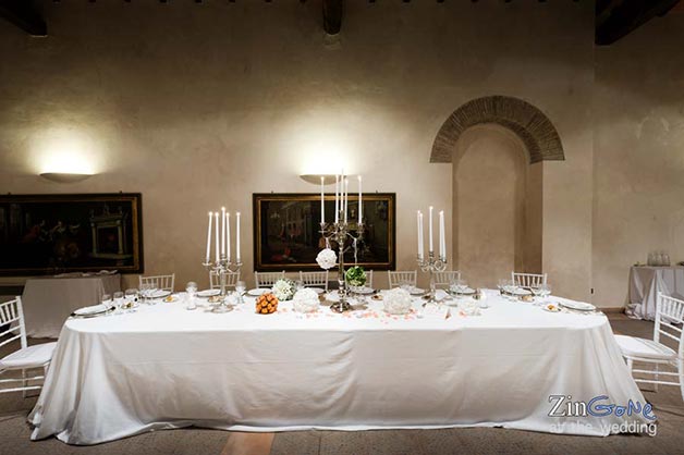 Fittings and trimmings were thorough and stylish; branched candlesticks and white furniture and fabrics gave a pale gothic twist that splendidly jarred with this XIX century building. Flower nosegays decorated both the candlestick and the newlyweds table and the gigantic chocolate cake almost stole the scene, drawing all the attention.