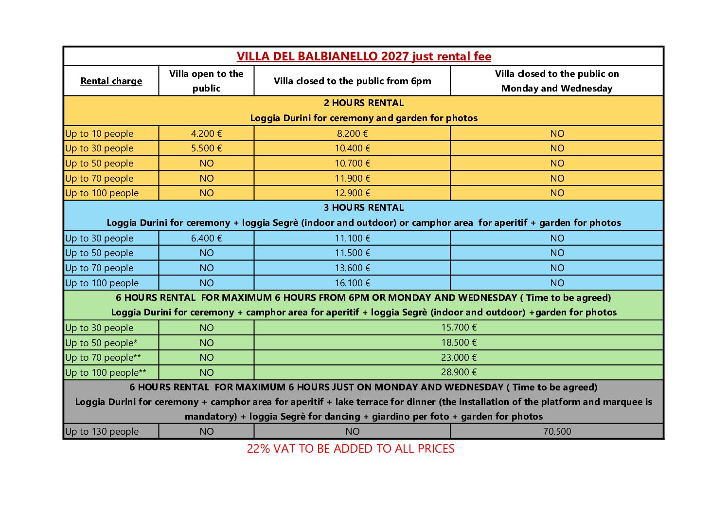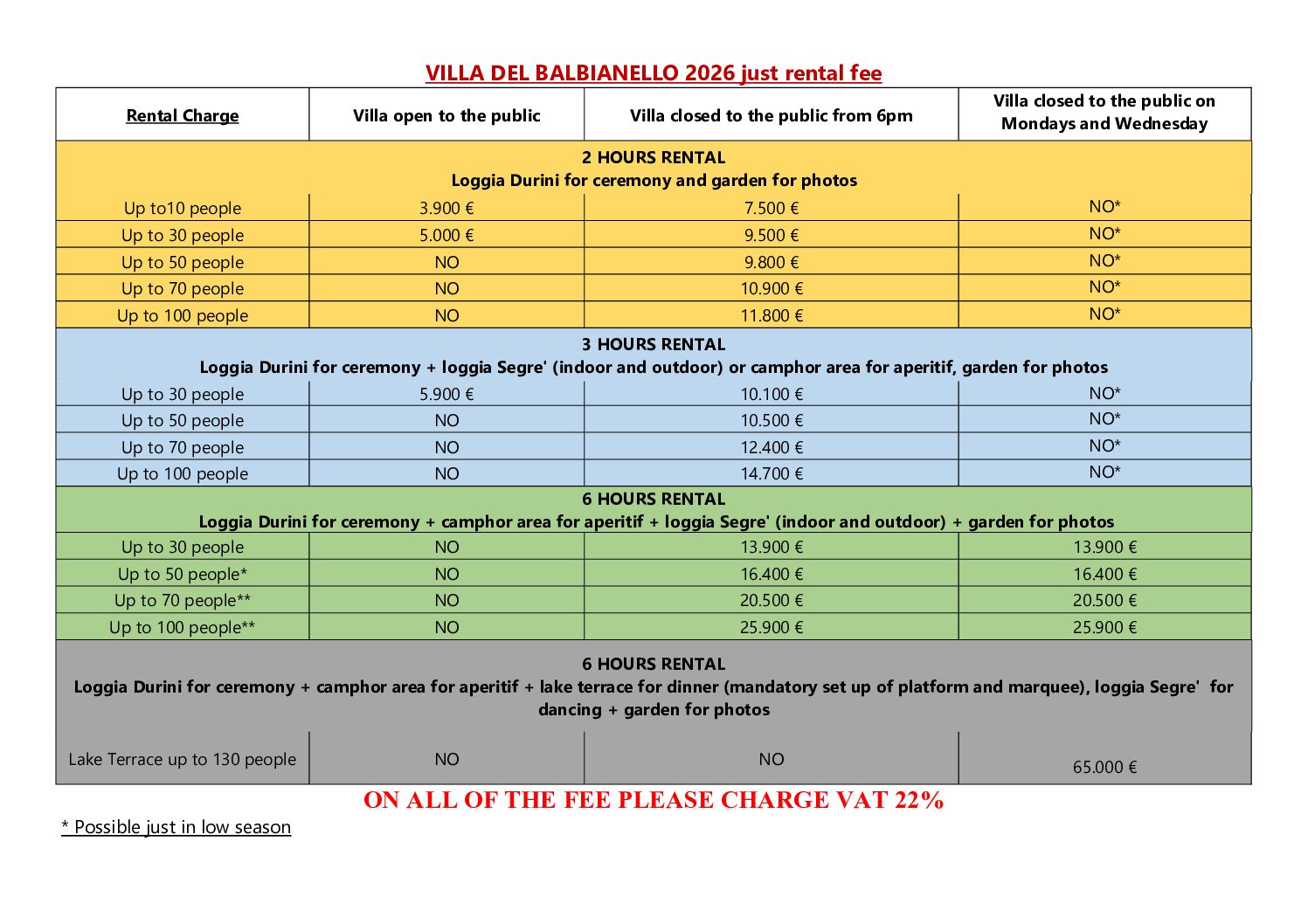 Villa del Balbianello rental fees 2026–2027 (official tables)