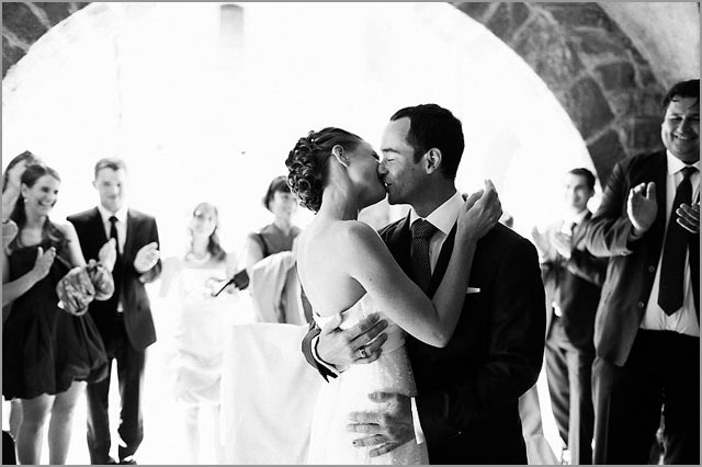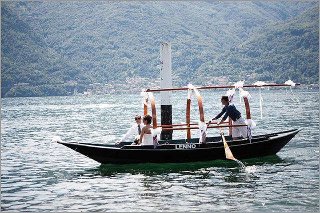 For Axel and Melanie we organized one of these old boats, got it decorated and had 2 strong men to row them 600 metres to Ossuccio with its really cute townhall. All guests were waiting and applauded at the arrival. As well the major awaited them under the historic arcades to start with the civil wedding ceremony.
