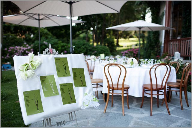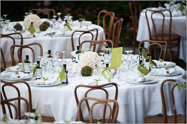 Finally we drove back to the Hotel San Giorgio, where we arranged a wedding dinner with local food. But before starting with the dinner, all guests had 2 hours to relax and to refresh themselves. In the meantime it was our task to arrange the table decoration, all in white and green colors. Together with lampions, candles, torches to create a very typical summer party in the beginning of a hot July.