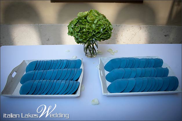 Just at the beginning of this amazing garden we placed two aviation blue leather kippah with the names of bride and groom that arrived directly from Jerusalem. From here a tree lined path lead the guess to the ceremony area perfectly arranged with a Chuppàh, the wedding canopy.