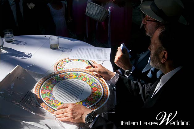 In this amazing frame, Rabbi read Ketubah text in front of the witnesses. Precious katubah made in Jerusalem had been signed by the groom and had been given to the bride before the binkhot ha-nissu’in, wedding blessings.