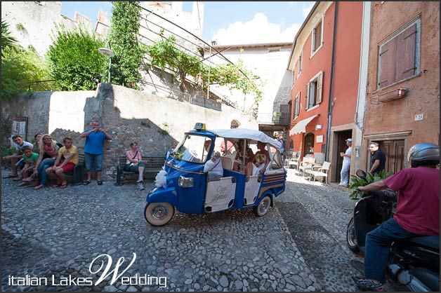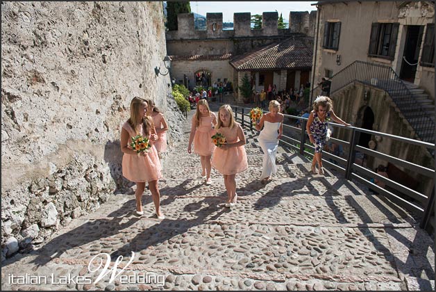 Jacki and her excited parents arrived at the castle on the applause of onlookers, in a typical Ape Calessino, a fun tuk-tuk while guests and peach-dressed bridesmaids announced their arrival with the characteristic sound of car engines on the narrow cobbled streets.