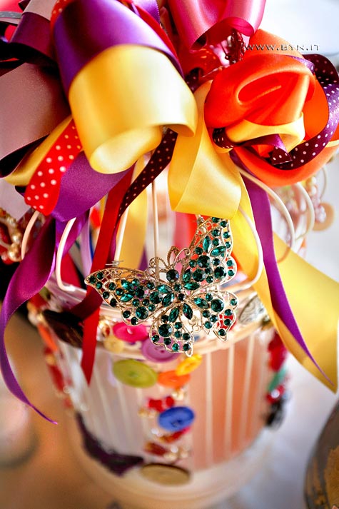 Here, every detail spoke about Georgie’s playful creativity. Bride created with her hands all the decorations with coloured ribbons and buttons, butterflies and beads.