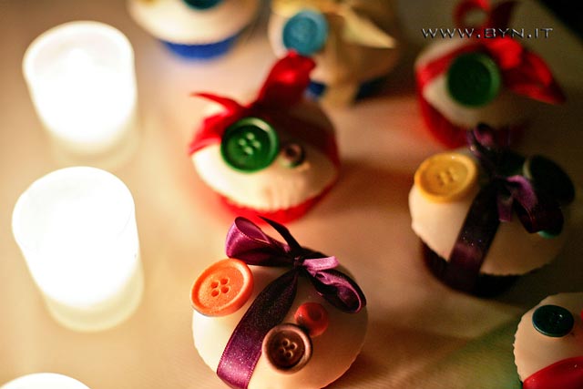The most original touch? Namescards made with small cakes with coloured sugar buttons.