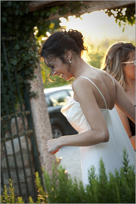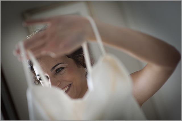 Her long white dress, her hair softly gathered by impalpable white flowers and only a pretty bow on shoes… Final preparations for the bride and everything is ready.