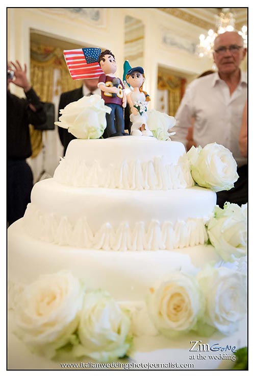 The dinner was served in the main function room that hosted also dances and cutting of the cake. A lovely and funny cake with two figurines on top, Lisa and Jim and their respective flags. Isn’t it sweet?