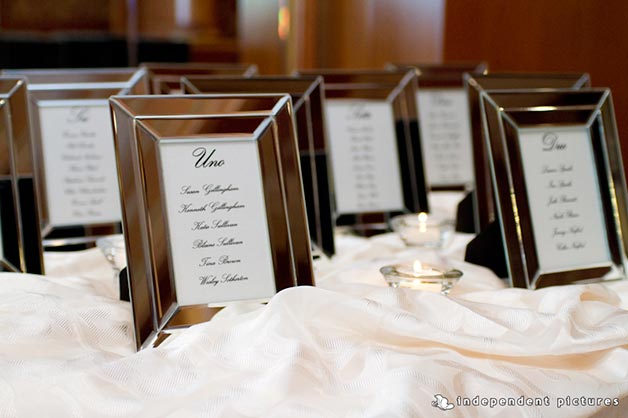 For her decorations Katie wanted something simple in white with candles to enhance the beauty of this room. As table plan lovely mirrored frames that matched sparking details of the room.