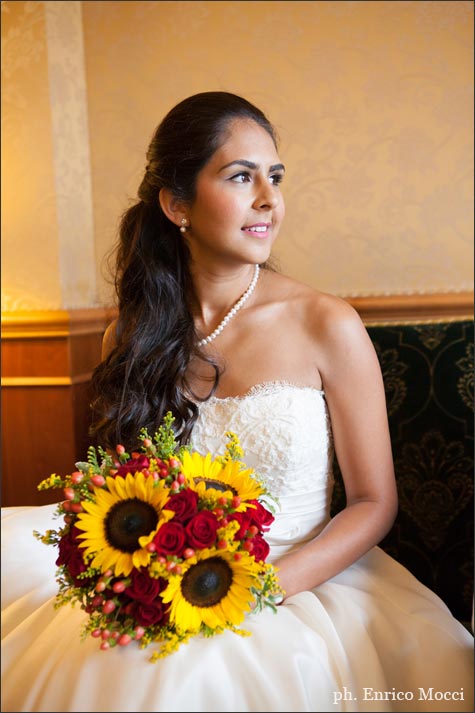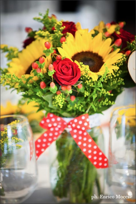 For her bouquet she chose a country and romantic style: sunflowers with red roses, hypericum berries and some greenery. The final result really matched her joyful style.
