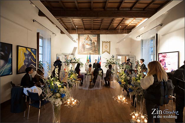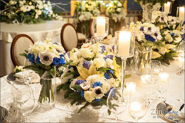 For the occasion ceremony venue at Palazzotto was decorated with tall vases with pines, roses, white frosty branches, gypsophila and a touch of blue with delphinium.