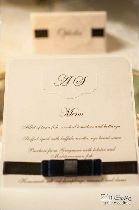 Bride choose white with deep blue velvet ribbons details for her hand made stationary on the table: names cards and menu cards perfectly matched the white blue theme she loved.