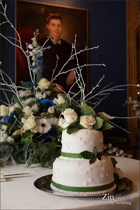 Wedding cake was prepared by Villa Crespi too. A small one, delicate winter themed wedding cake with green details and a big composition side of it with same winter flowers and some white branches to enhance this special moment.