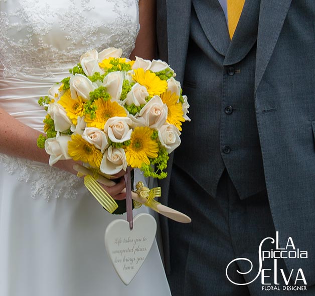 She wanted an happy yellow themed wedding. La Piccola Selva floral designer Team created for her a romantic bouquet with white roses and yellow gerberas matching Mat’s buttonhole and tie. But most of all flowers matches… Jacqueline’s shoes!