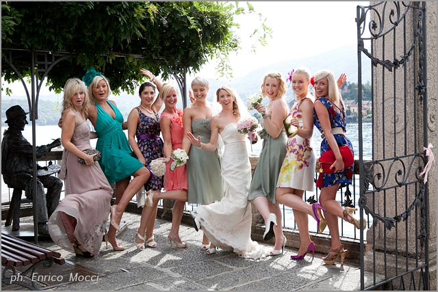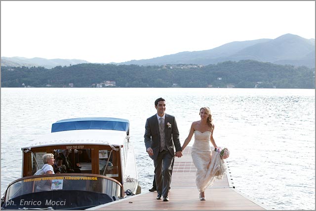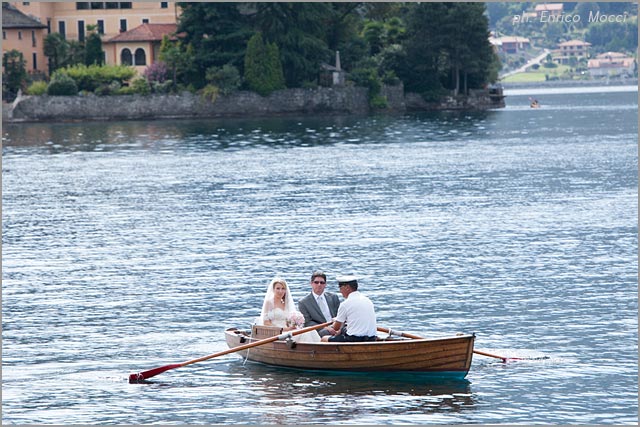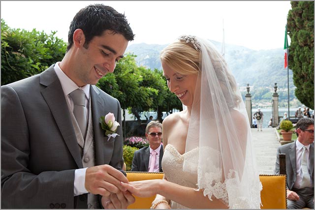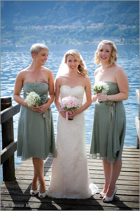We arranged the civil wedding at the historique townhall called Villa Bossi. The civil wedding takes place outside in the beautiful garden. With the sun shining so nicely, a blue sky, we all waited for the arrival of the beautiful bride Louise. She came with her father in a rowing boat and was welcomed by her 2 bridesmaids before she walked down the natural path which suited as an aisle like in a church.