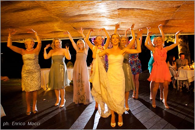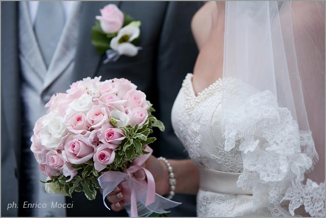 Look at her beautiful bouquet that was prepared by our preferred florist La Piccola Selva. Same colors and shape for the bridesmaids and lots of white and pink rose petals for the newly weds.
