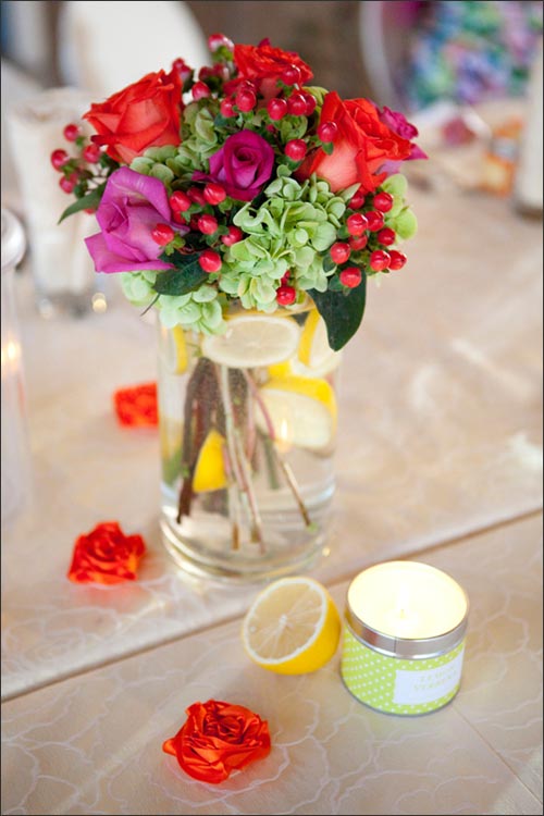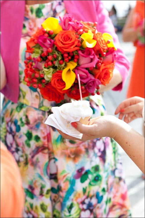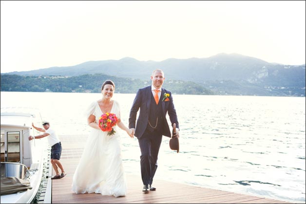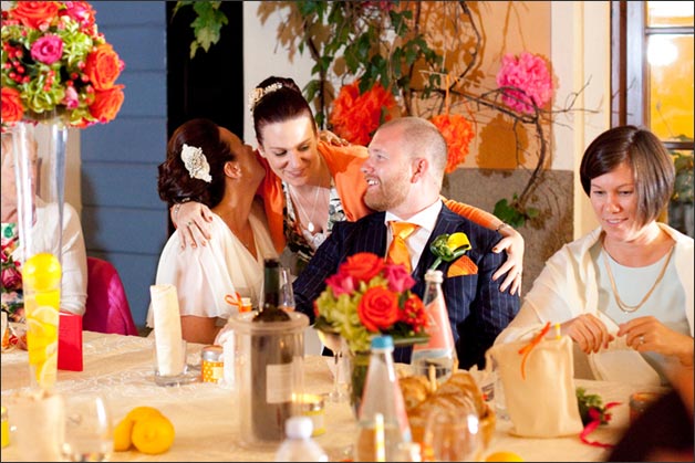 From these little details you can understand a little of Adele’s color palette: orange, green, yellow and fuchsia. Such an original choice! It was simply perfect for a Summer event on Lake Orta. Orange was the main color of these and you could see everywhere: in bridal bouquet, flowers and decorations and wedding favours for the reception, Adele’s shoes, men’s ties and groom outfit details.
