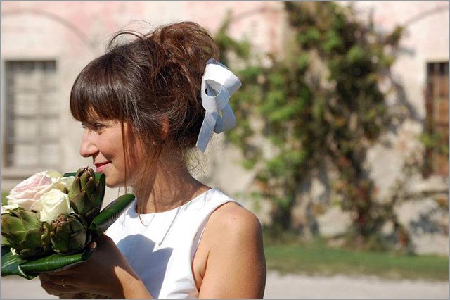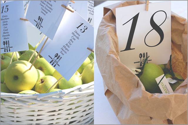 The choice felt on the green theme, on plants and fruits, everything was natural and eco-friendly. In honor of the groom, who is a vegetarian, the bouquet was made with roses and artichokes, little apples were used as placeholders and the favor bags were made from recycled paper and hemp seeds. “The smallest of all seeds, that becomes a large tree where birds find shelter and nest” Marianna reminded us in a written note citing the Gospel.