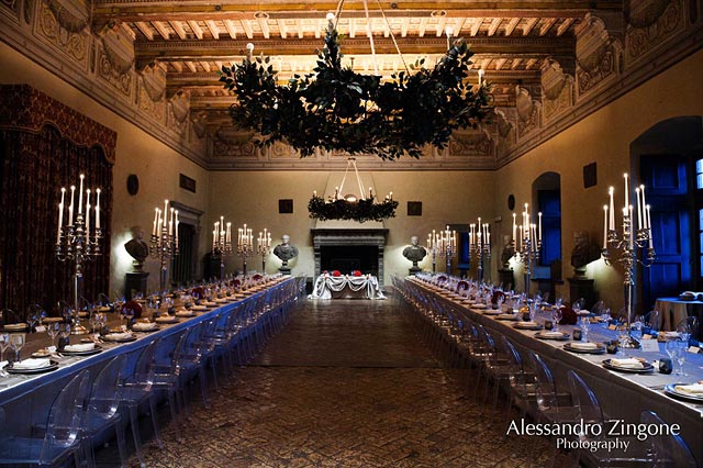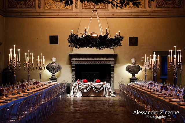 After that gorgeous Caesar’s Room with its frescoed by Antoniazzo Romano, coffered ceiling and antique chandeliers decorated for the occasion with green bay leaves, has been the unique set for Stefano and Luisa dinner reception.