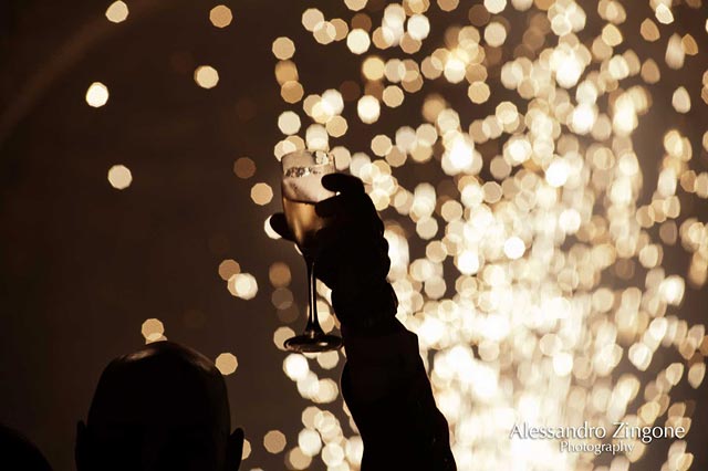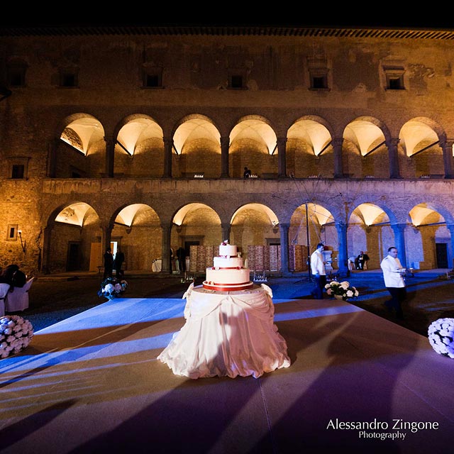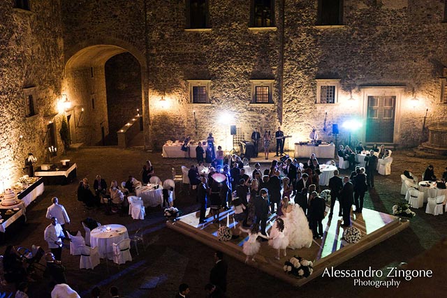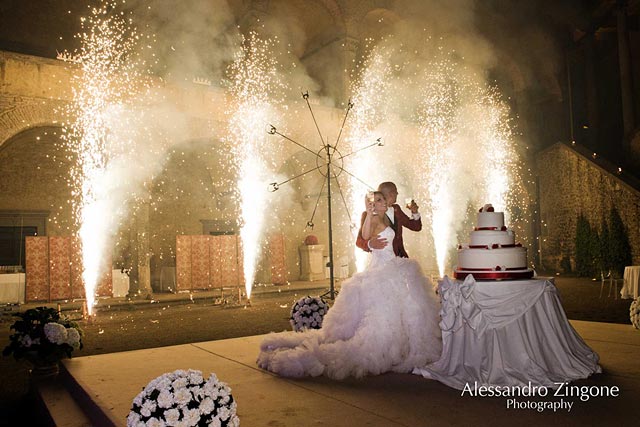 Light games, fountains of fire and music for the dramatic cut of Luisa and Stefano’s wedding cake. It was planned in the courtyard of the castle, a perfect end for such a fairy tale wedding.