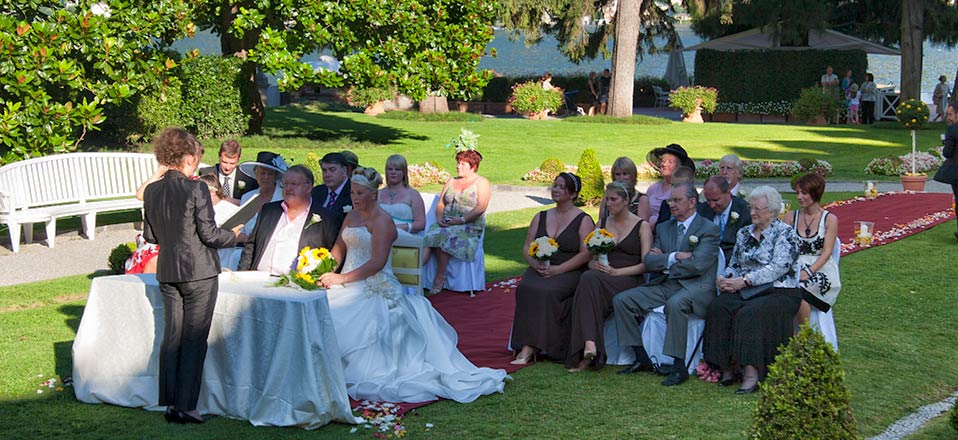 As the guests arrived to take their seats I wondered about the many historic public figures and famous celebrities that had also been spellbound by this enchanting and majestic villa. It was a very surreal moment… ‘The Flower Duet’ from Lakme initiated the proceedings, which was a fitting accompaniment to such a creative floral arrangement. Janet began to make her way towards me accompanied by her father. Her hairstyle was captivating and creative, reflecting the bride’s personality and was the subject of much discussion amongst the guests. The groom was without doubt one of the most relaxed I have ever seen! However he was clearly moved and I found myself also overcome with emotion during the mutual swearing of their vows. The bride had told me that they had chosen the villa because they had fallen in love with one another here during an early trip taken together, thus proving that Villa D’Este casts a powerful spell…
