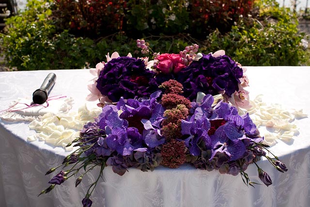 During the meeting with the florist I thought about something different for the ceremony table and after having excluded several options, our final decision is exactly what you can see in these pictures: a giant and colorful butterfly created with many different type of precious flowers. My lovely bride, Christine, just loved the final effect of the decoration for her unforgettable wedding on Lake Como!