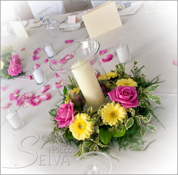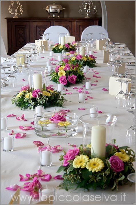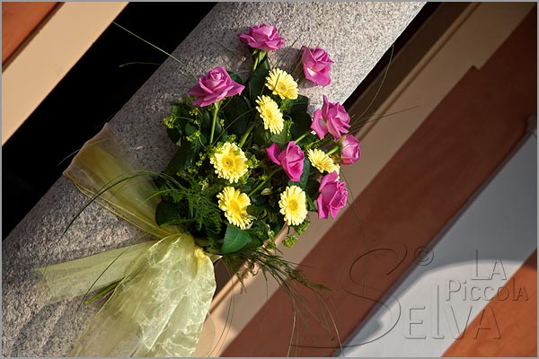 Every floral arrangement Siobhan and Stuart chose recalled pink and yellow. Villa Bossi columns arrangements, flowers on the table of ceremony, petals on the aisle and centerpieces for reception to Hotel San Rocco.